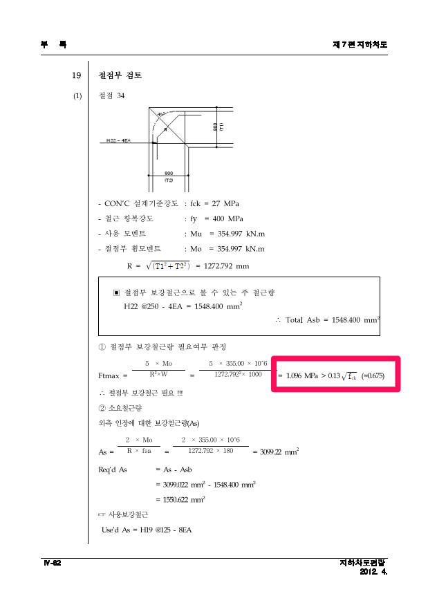라멘절점부에 외측인장 혹은 내측인장을 일으키는 휨모멘트가 작용하는 경우 [콘크리트구조 설계기준.해설(2003)] 15.3에서는 「스트럿-타이 모델 등을 사용하여 계수하중에 의해 산출된 대각선방향의 단면에 생기는 인장응력의 크기가 √Fck/3를 넘는 경우에는 철근을 배치하여 이러한 인장응력에 의해 발생하는 균열을 사전에 제거해야 한다」고 규정함으로써 계수하중을 적용하는 방법을 제시하고 있다.