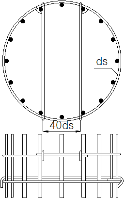 ① 원형 띠철근 중에서 양단에 90°갈고리를 갖고 1개소 또는 2개소에서 철근 지름의 40배 이상으로 겹침이음된 원형 후프띠철근에 2개의 보강띠철근이 후프띠철근의 겹침이음 구간을 감싸는 경우에는 완전원형후프로 간주할 수 있다. 이때 후프띠철근의 90°갈고리는 축방향철근에 걸리게 하여야 하며, 2개의 보강띠철근은 후프띠철근의 겹침이음 구간의 양쪽 끝부분에배치하여야 한다. 또 교각의 종방향과 단면 평면방향으로 보강띠철근의 90°갈고리가 연달아 걸리지 않도록 보강띠철근의 양단을 바꿔주어야 하며, 원형 후프띠철근의 겹침이음 부분이 교각의 종방향으로 연달아 위치하지 않도록 배치 하여야 한다.